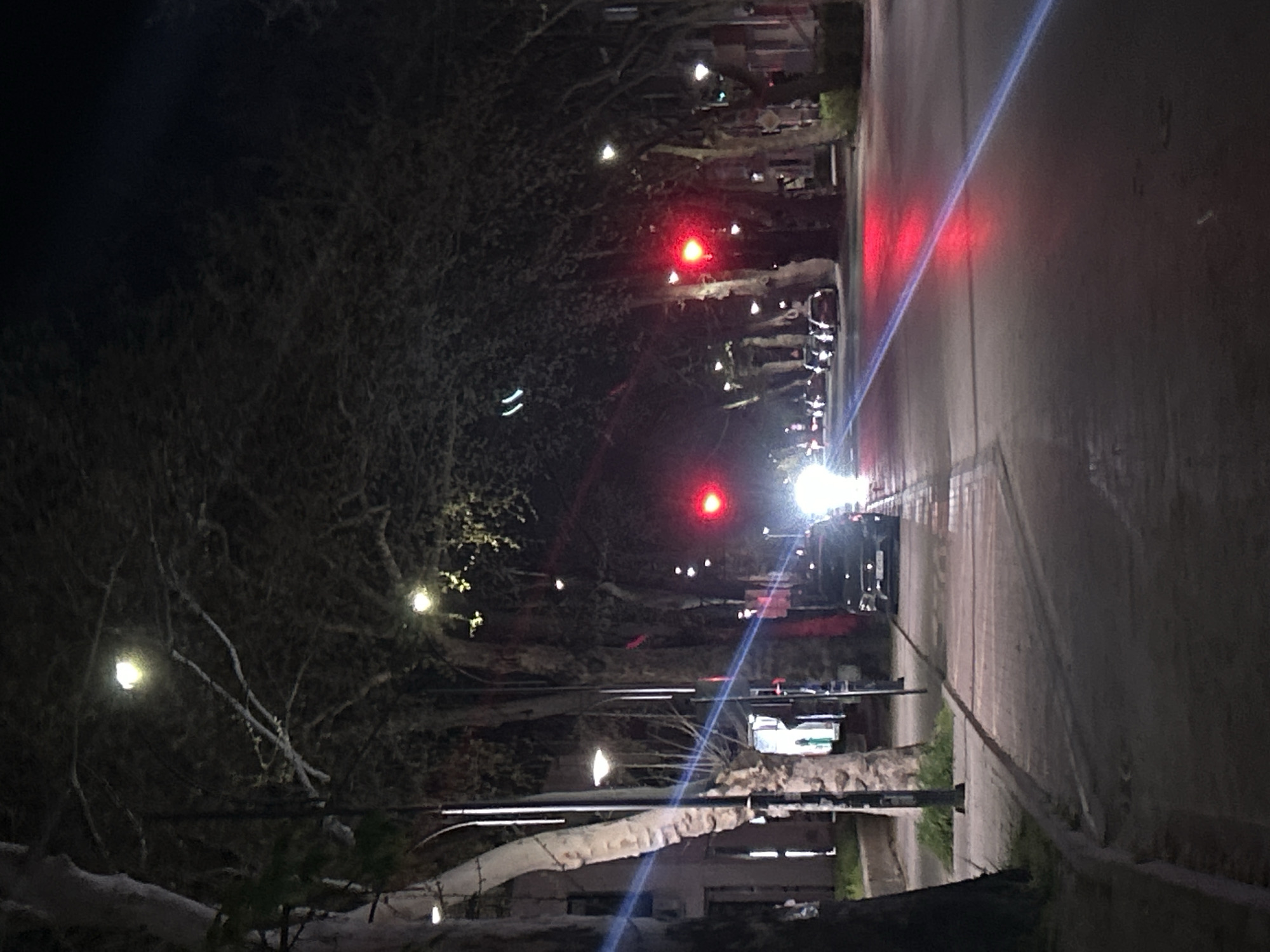 The image depicts a night scene of a street in Silistra, Bulgaria. The street is lined with trees, some of which are illuminated with string lights. A vehicle is visible with its headlights on, facing the viewer. The road appears wet, reflecting the red lights from a traffic signal. The surrounding environment is dark, with the trees forming a dense canopy on the left. Sidewalks are dimly visible along the road. There are no people immediately visible in the foreground. A structure that looks like a bridge or decorative archway is partially seen.