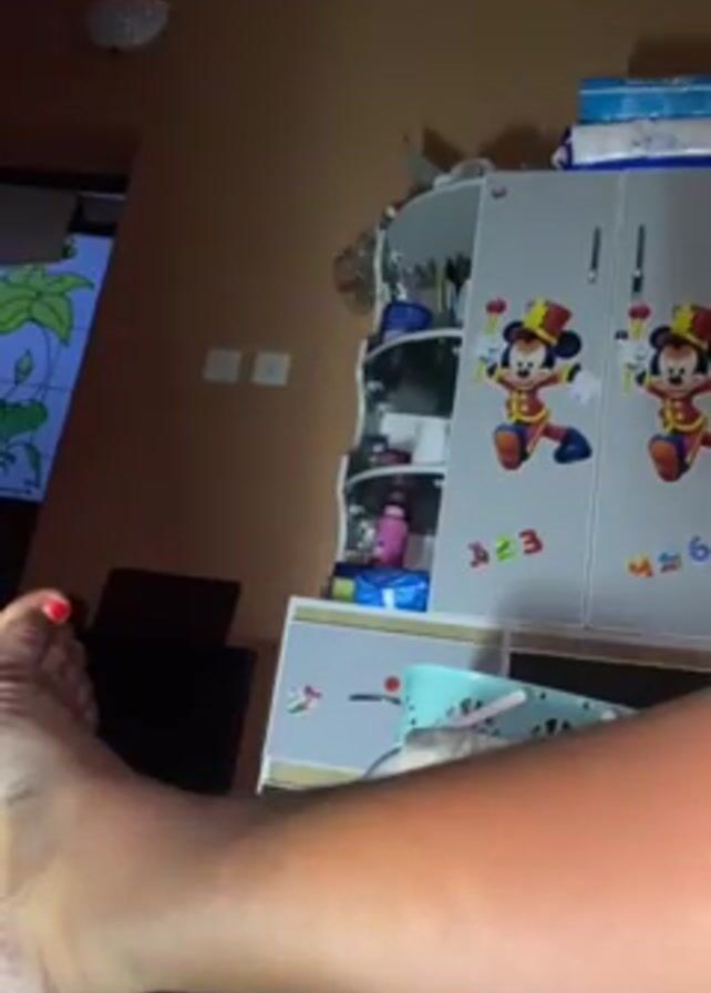 A close-up, static shot shows a person's lower leg and foot, which is angled with the toes pointing upward. The big toe is painted with red nail polish. The leg appears to be resting on a surface, with the background consisting of a wall painted a warm color, along with children's furniture, including a small white cabinet decorated with Mickey Mouse figures and numbers. Part of a window or framed picture featuring a green leafy design is visible in the left background.