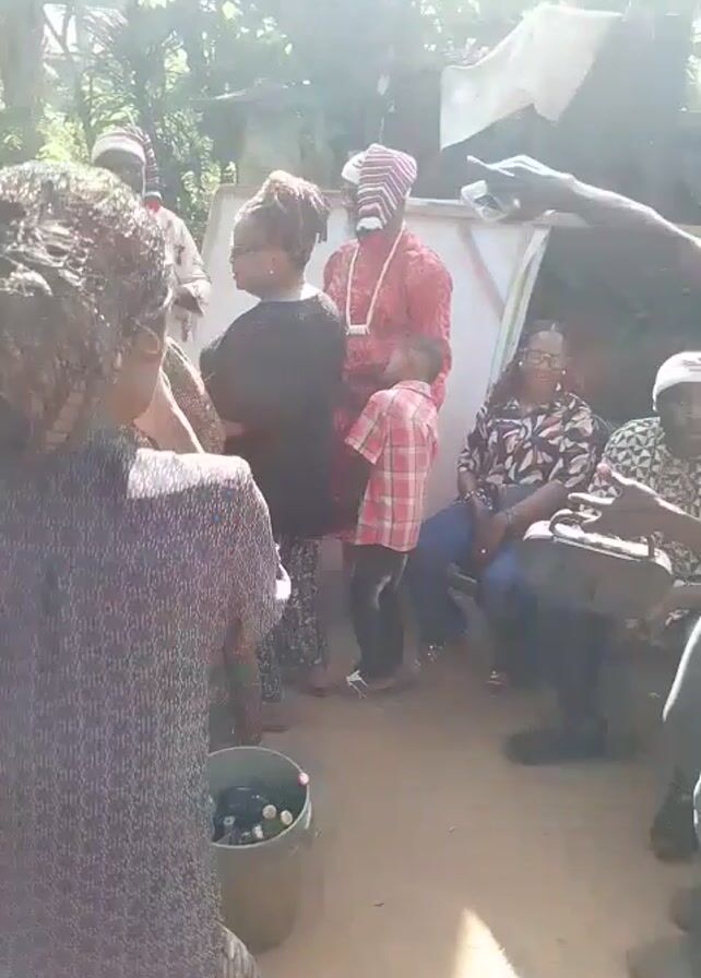 The video depicts a group of people gathered in what appears to be an outdoor area, possibly a yard or open space. There are several women and at least one man visible in the video. The women are dressed in various types of clothing, including dresses and patterned tops. One of them is wearing a head covering. The man is wearing a white shirt and jeans. The group appears to be engaged in some kind of activity, as some individuals are moving around and interacting with each other. The background environment includes foliage, suggesting a natural setting. Additionally, there is a container with bottles visible, and what seems to be a white board. The overall impression is of a social gathering or event taking place outdoors.