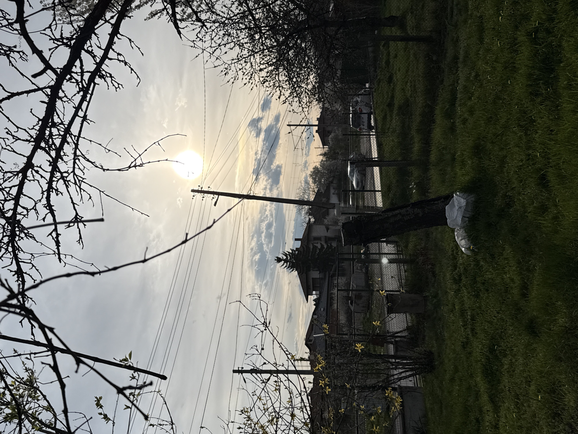 landscape in Slivnitsa, Bulgaria, captured from a low angle. The scene is dominated by a bright sky with the sun partially obscured by thin clouds. Utility poles with power lines stretch across the sky. Tree branches, some bare and some with early spring buds, frame the upper left and lower right corners of the image. In the middle ground, there's a house with a fence and some greenery. In the background, a few cars are parked along the street. The ground is covered in grass. A tree trunk is visible in the foreground, partially wrapped in white plastic.