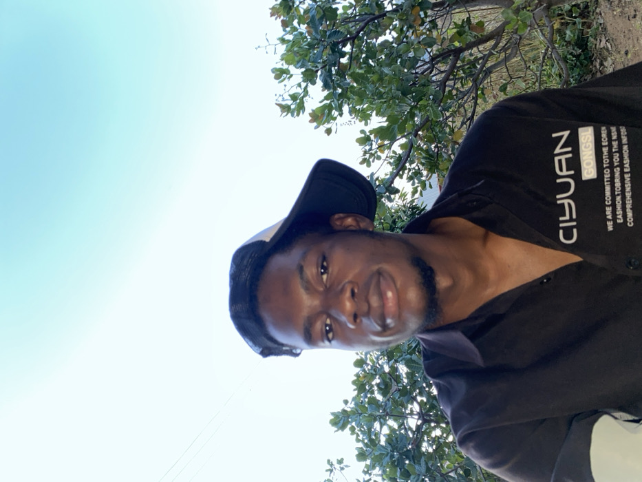 A male individual is depicted outdoors in a vertical-format, eye-level shot, positioned centrally. He is of apparent African descent, with dark skin, short dark hair, and a slight goatee. He wears a dark, collared shirt with the top three buttons undone and a black baseball cap with a white mesh back, worn backward. The shirt's left side features white text, including "CIYUAN", "GONGSI", and smaller lines below that read "WE ARE COMMITTED TO THE EOREN EASHION.TOBRING YOU THE NEW COMPREHENSIVE EASHION INFOS". He gazes directly at the camera with a neutral expression. The background consists of dense green foliage from trees or bushes, with a light-colored structure partially visible behind the foliage on the right. The upper background is a clear, light blue sky, traversed by thin dark lines (likely power or communication wires) in the upper left quadrant. The scene is illuminated by natural daylight. The depicted location is Udu, Nigeria.