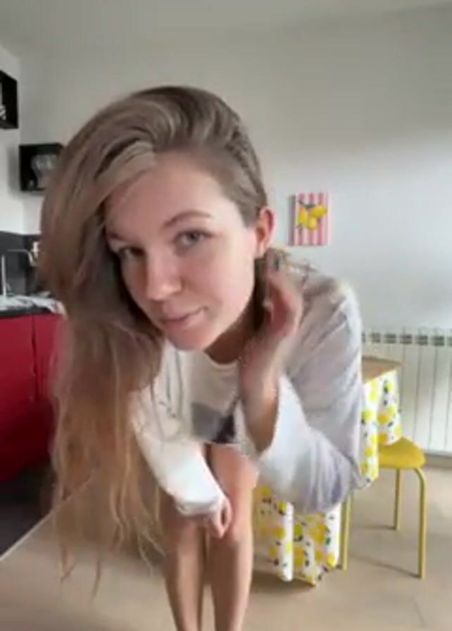 A woman with long brown hair, wearing a white long-sleeved shirt with a graphic of a black dog on it, short blue and white striped shorts, and brown furry slippers, sits on the floor in a room. The room has white walls, a hardwood floor, a red cabinet, a table with a yellow and white lemon-patterned tablecloth, and a yellow chair. The woman adjusts her hair. The music plays in the background.