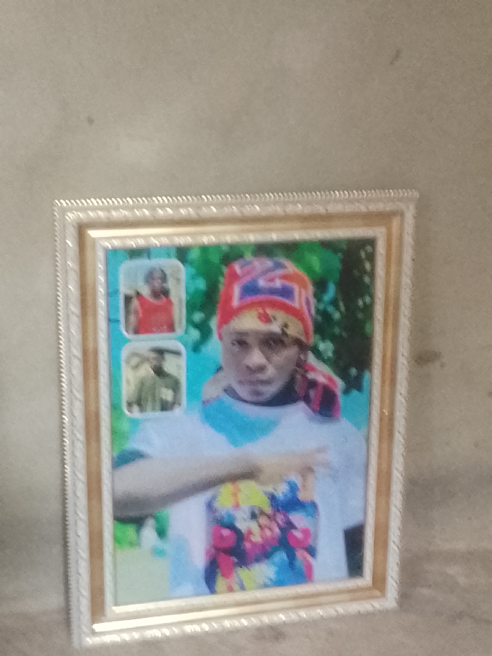 A vertically oriented framed picture rests against a textured, light beige wall in Unknown, Unknown. The frame is light-colored, likely cream or light gold, featuring an ornate, patterned design on both its inner and outer borders. The primary image within the frame displays a dark-skinned individual, appearing male, looking directly at the viewer with a neutral expression. This individual wears a multi-colored head covering, predominantly red and blue with yellow and white accents and a prominent '2' or 'Z' symbol. They are dressed in a white t-shirt featuring a light blue horizontal stripe across the upper chest/shoulders and a vibrant, multi-colored abstract graphic on the lower torso. Their right arm is bent, with the hand positioned over the chest area. The background of the main image shows blurred green foliage, suggesting an outdoor setting. Two smaller, rounded-rectangle inset images are vertically stacked on the left side of the main picture. The top inset shows a dark-skinned individual wearing a red tank top against a light blue background. The bottom inset features a dark-skinned individual wearing an olive-green shirt or jacket, possibly with a hat, against a blurry outdoor background. The wall behind the frame exhibits minor discoloration and a slightly uneven texture.