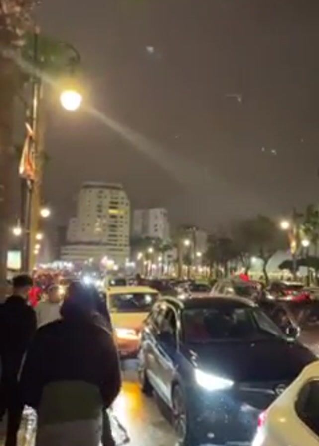 street scene at night, likely in a city, with dense traffic and people walking on the sidewalk. Cars are lined up bumper to bumper, and streetlights illuminate the area. Some people are walking along the sidewalk, casually dressed. Buildings are visible in the background. The overall atmosphere suggests a busy urban environment, possibly a main street, with some kind of celebration or gathering. The weather appears to be damp, with possible rain or mist.