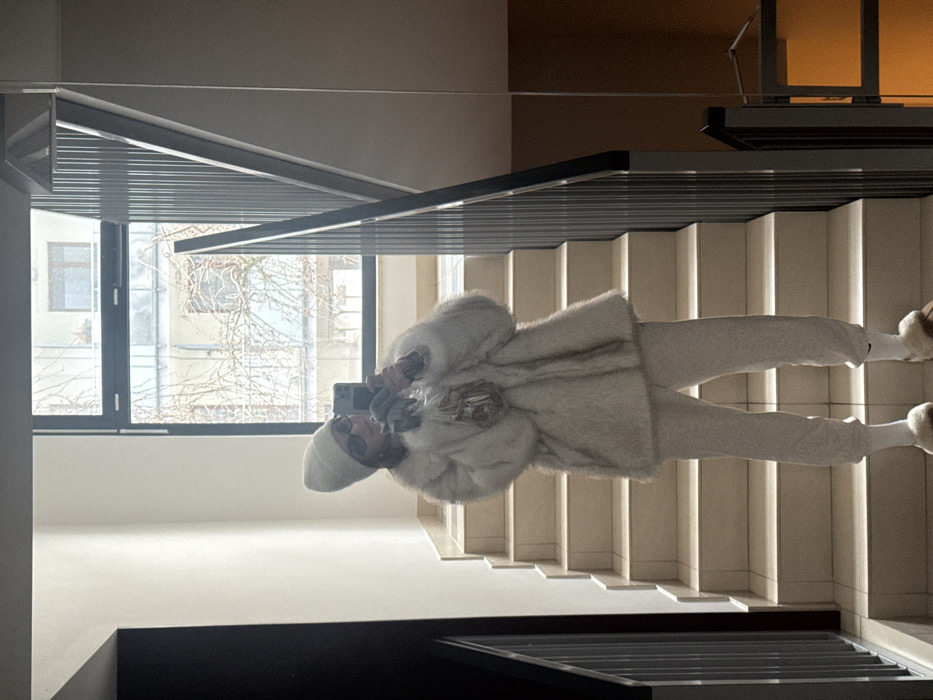 An individual is depicted in a full-body selfie taken in a mirror within an interior stairwell of a building in Warsaw, Poland. The subject, a person with visible dark hair under a light-colored knitted beanie, wears dark-rimmed glasses, a voluminous cream-colored faux fur coat, light grey sweatpants, white socks, and brown fluffy slip-on sandals. Their right hand holds a dark-cased smartphone, angled as if capturing the reflection. The left hand holds a transparent plastic bag containing a single golden-brown baked good, possibly a pretzel or pastry. The background consists of a light-colored staircase with tiled steps and risers, ascending from the bottom of the frame towards the upper right. A dark, vertically-slatted metal railing parallels the stairs on the right side. The walls are light-colored, and a large window in the upper center reveals an exterior urban scene with bare tree branches and distant building facades under an overcast sky. A dark vertical panel is visible on the far left, and a two-toned wall section (light upper, darker lower) is present on the far right.