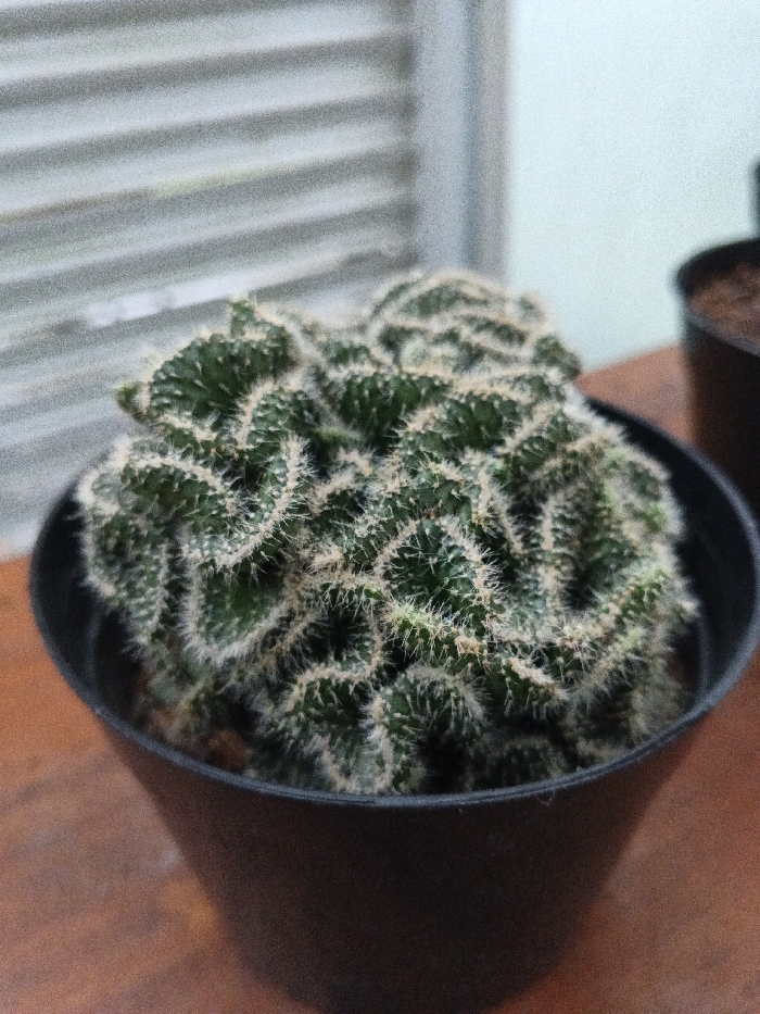 A potted cactus, possibly a Mammillaria Cristata, fills the frame. It has a convoluted, brain-like structure with dense, small green tubercles. Fine, white spines line the edges of each tubercle, creating a fuzzy appearance. The cactus sits in a black plastic pot, set on a brown wooden surface. Soft, diffused light illuminates the plant. Blinds are visible in the background.