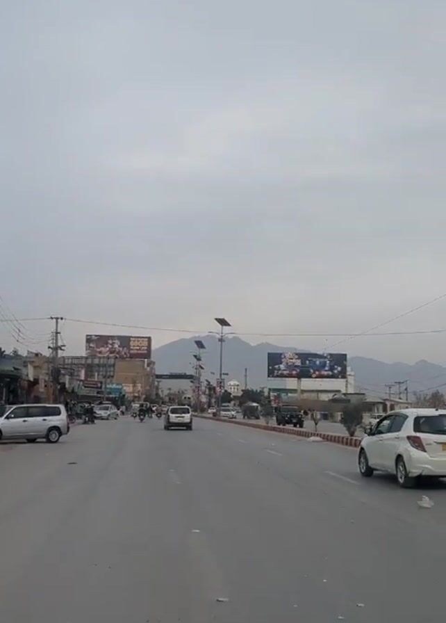 wide, gray street with a few cars and motorcycles driving on it. The sky is overcast, and in the distance, there is a mountain range. Along the sides of the street are buildings, some of which appear to be shops. There are billboards on either side of the street, and solar-powered street lights line the median. The overall impression is of a city street in a somewhat muted setting.