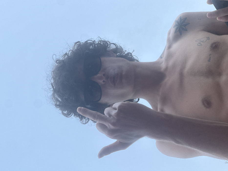 A low-angle shot captures a shirtless person with dark curly hair and sunglasses against a pale blue sky