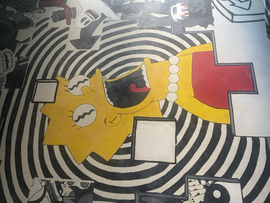 A wall mural features Lisa Simpson with swirly eyes and an open mouth. She wears a yellow dress with a red square and a pearl necklace, against a black and white swirling background. Surrounding her are abstract, cartoon-like figures in black and white. Small white squares are scattered throughout the image.