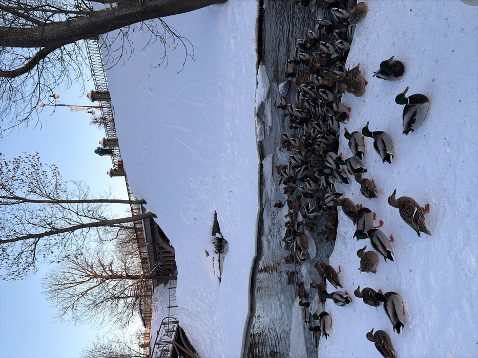 The image depicts a winter scene along a partially frozen river or canal in Hrodna, Belarus. Snow heavily covers the ground, banks, and the surface surrounding open water. A large concentration of mallard ducks, numbering approximately 100 or more, occupies the foreground and midground. Both male drakes, characterized by iridescent green heads, and female hens, with mottled brown plumage, are visible. The ducks are densely gathered on the snow-covered banks at the water's edge and within the unfrozen sections of the dark water, which contains several ice floes. In the background, an arched bridge spans the waterway. To the left of the arched bridge, a pedestrian bridge with dark metal railings ascends a snow-covered embankment. On the right, an elevated, snow-covered embankment is bordered by a decorative dark metal railing with columnar posts and streetlights. A lone individual, dressed in a blue jacket, stands on this elevated embankment near the railing, looking towards the water. Bare deciduous trees with slender branches are visible against a clear, light blue sky.