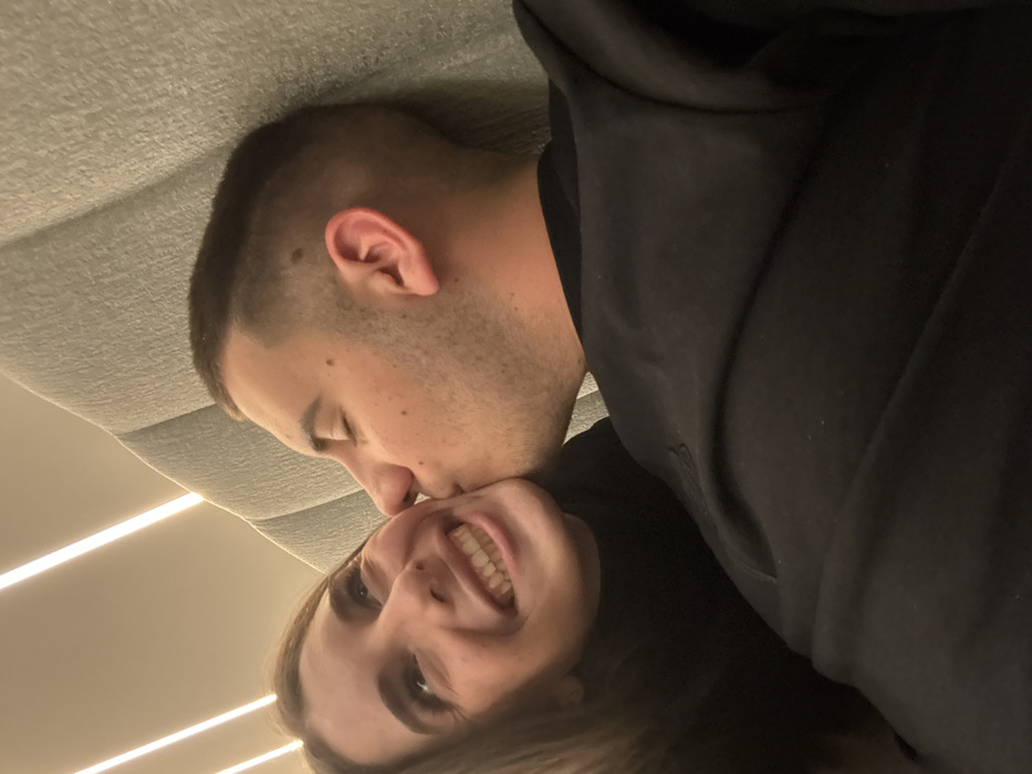 The image displays two individuals, an adult female and an adult male, situated in an indoor environment in Trud, Bulgaria. The female, positioned on the left, has brown hair and wears a dark, high-collared garment. She is smiling, revealing her teeth, and looking upwards and to the right. The male, on the right, has short dark hair and is wearing a black crew-neck sweatshirt. His eyes are closed as he presses his lips against the female's left cheek, performing a kiss. The background features a light-colored, padded surface with vertical segmentation, consistent with a headboard or upholstered seating. Overhead, two parallel vertical light strips provide warm, artificial illumination.