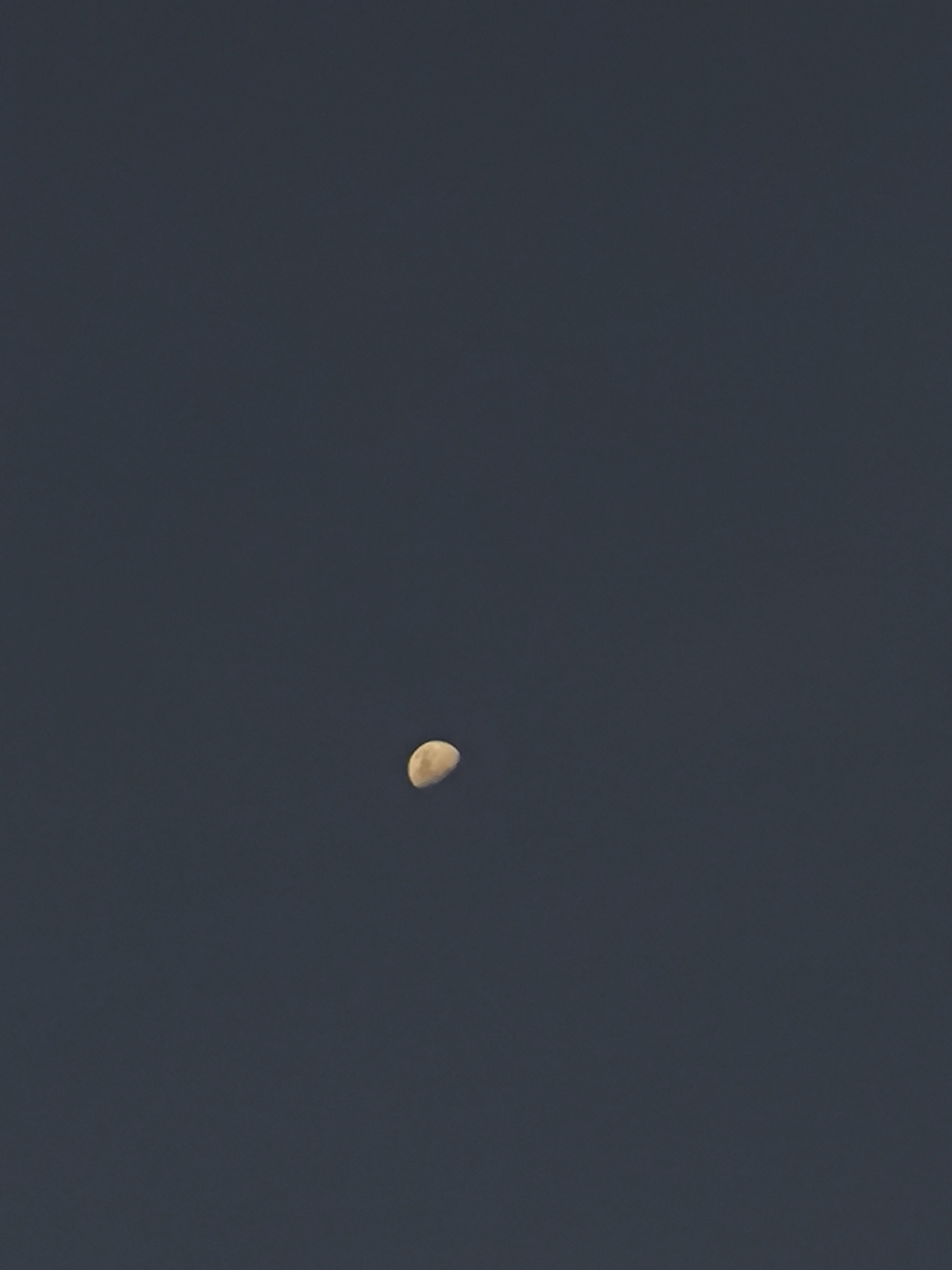 A gibbous moon is centered in the lower-middle-right of a dark blue-grey sky, observed from La Guardia, Venezuela