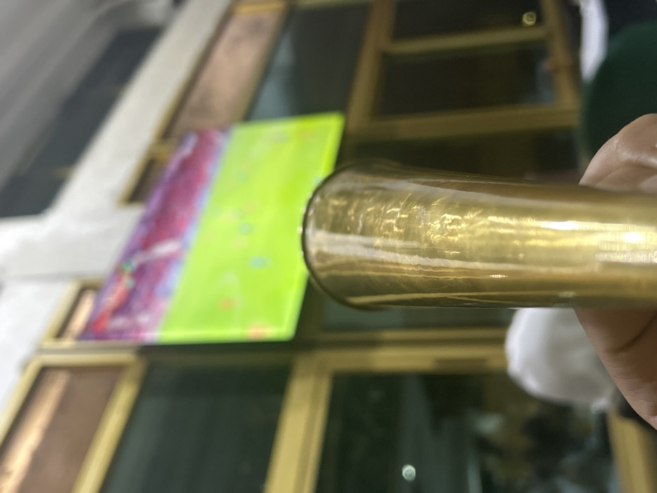 A close-up shot showcases a brass-colored tube, possibly metal, held in a hand. The tube's surface is reflective. A window with square panes is visible in the background. One pane holds a colorful, rectangular object split into pink and green halves. Another nearby window pane contains a brown rectangle. A blurred white mass sits in the lower right corner. The focus is on the tube and its surface details.