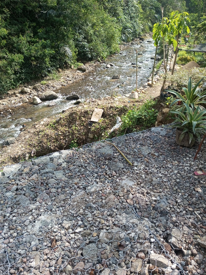 A shallow river flows alongside dense vegetation. A retaining wall of rocks held in wire mesh descends towards the riverbank. A potted plant sits near the top of the wall, along with small trees and other foliage. A stick rests on the rock-filled mesh, and a discarded board lies on the bank near the water. The river reflects sunlight as it runs through the scene.