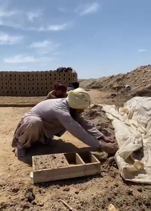 Two men in traditional garb crouch in a dusty landscape, making mud bricks. One man fills a three-sectioned wooden mold with mud, packing it in. Behind him, another man works, and a stack of drying bricks is visible. In the background, there are piles of mud and a light blue sky with a few clouds. A white tarp lies to the right of the frame.