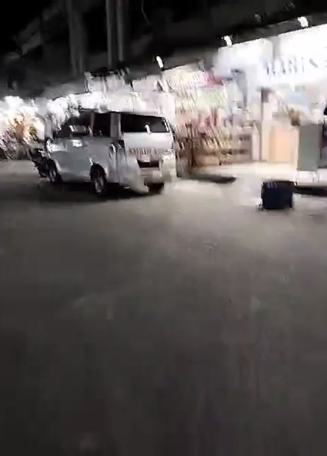 The video depicts a white ambulance parked on a street lined with shops. The scene is at night, illuminated by streetlights and the lights emanating from the shops. The ambulance's rear is facing the camera, with the word "AMBULANCE" clearly visible. A few people can be seen indistinctly near the shops. The road surface is asphalt. The lighting is somewhat dim, casting shadows and making it difficult to see details in the background. A motorcycle can be seen parked in the background. A dark blue trash bin is located on the side of the street.