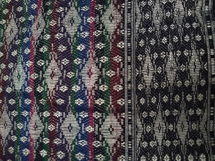 The image displays a tightly cropped, detailed view of a woven textile. This type of fabric is characteristic of traditional craftsmanship found in locations such as Pokhara, Nepal, though no specific city landmarks or environmental context are visible within the frame, as the image focuses solely on the fabric's surface. The textile features a complex, multicolored pattern with visible weave texture. The upper two-thirds of the image comprise alternating horizontal bands. These bands include sections of dark blue, green, maroon, black, and purple, interspersed with narrower bands of white or light gray. Within these bands, recurring white diamond or rhomboid motifs are intricately woven, creating a textured relief. Thin, solid horizontal stripes in colors such as magenta or pink also traverse the upper section. The lower third of the image is distinctly separated by a thick, dark horizontal border featuring fine linear patterns. This lower section is predominantly dark (black or very dark blue) and is adorned with repeating rows of smaller, light-colored diamond motifs. The very bottom edge exhibits additional fine, light-colored linear woven patterns. The overall impression is a dense, coarse-weave fabric exhibiting intricate geometric and striped designs. No people, subjects other than the fabric, or discernible actions are present.