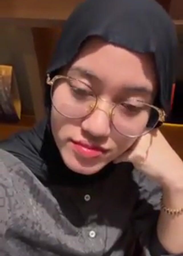 A young woman wearing a black hijab, glasses, and a gray patterned shirt poses for a video. She is sitting indoors, possibly in a restaurant or lounge, given the wooden shelves and book behind her. She adjusts her glasses and touches her chin. There is soft lighting and music in the background.