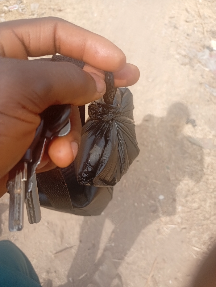 A person is holding a black plastic bag, tied at the top. The person is holding a key in their other hand. The image is taken from a low angle and the person is standing on what appears to be a dirt road or path. The background is blurred and shows a dry, sandy environment. The coordinates provided are for a location in the city of Assai Sabongida, Nigeria. The scene is located on a dusty, outdoor path. There is a person's arm and hand visible in the image. The hand is holding a black plastic bag, tied off at the top. The bag is empty. A set of keys is partially visible, being held in the same hand, next to the plastic bag. The person is wearing a blue shirt, but most of it is not in the image. The path is a dirt path and has a rough, dry texture, appearing to be a common pedestrian path. There is a shadow visible of the person's body in the path, indicating that the person is standing in bright, natural lighting. The scene is an unassuming, typical, rural setting, with no specific details indicating anything more than everyday life.