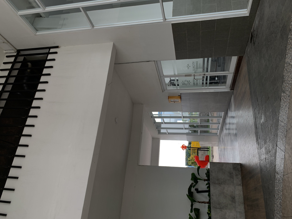 An indoor walkway leads to an outdoor playground. A black metal staircase is visible on the left, adjacent to a white wall. Sunlight filters through the corridor. A planter with greenery stands on the right side of the walkway, near the playground entrance. Tiles cover the upper portion of the walkway. A sign on a glass door reads "SUNCITY RESIDENCE."