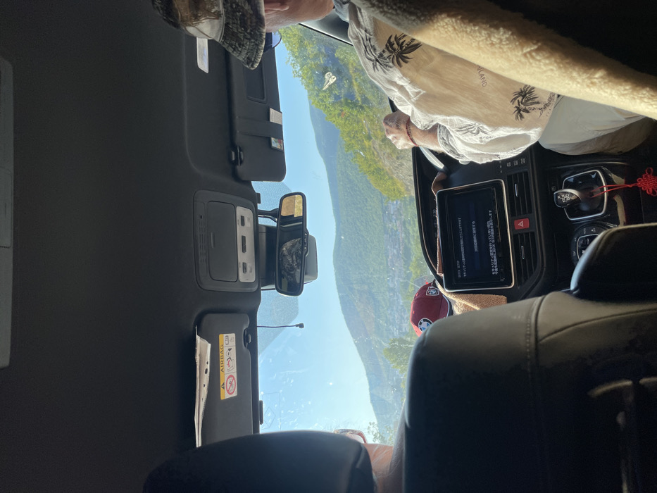 The image captures the interior of a vehicle from a rear passenger perspective, looking forward through the windshield on a clear, sunny day