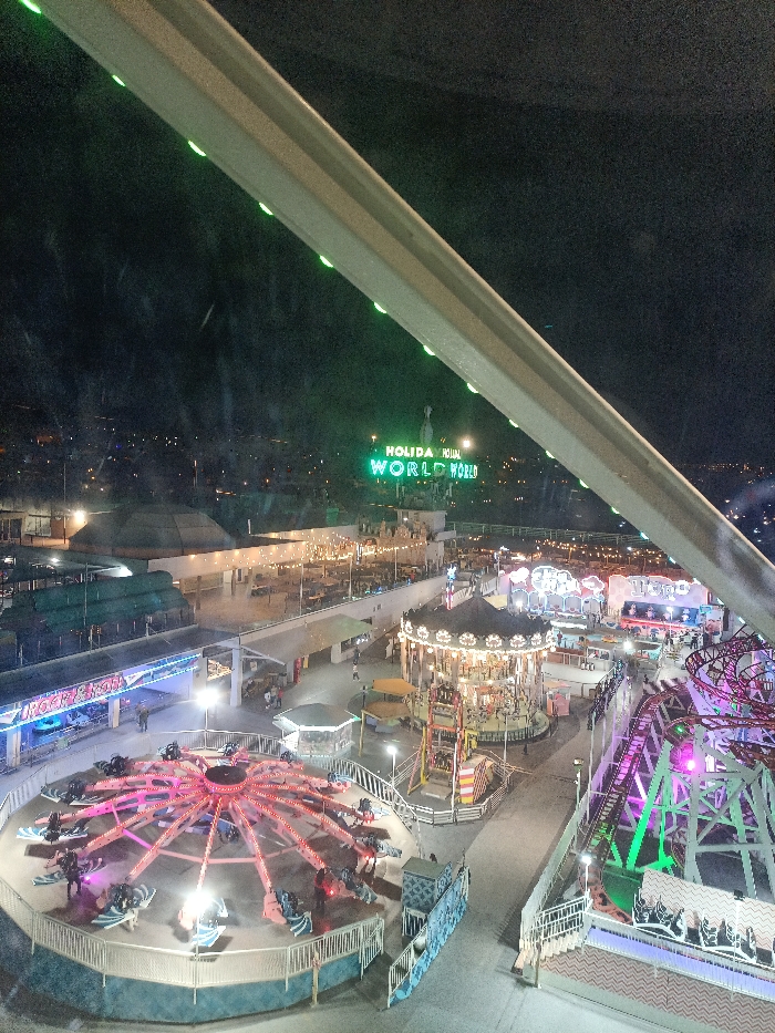 At night, the Holiday World amusement park is illuminated with vibrant lights. A brightly lit carousel and a spinning ride occupy the foreground. In the background, a large green sign reads "HOLIDAY WORLD". The park appears to be viewed from a high vantage point, likely a Ferris wheel, and a structural beam partially obstructs the view. Buildings and additional rides are scattered throughout the park.