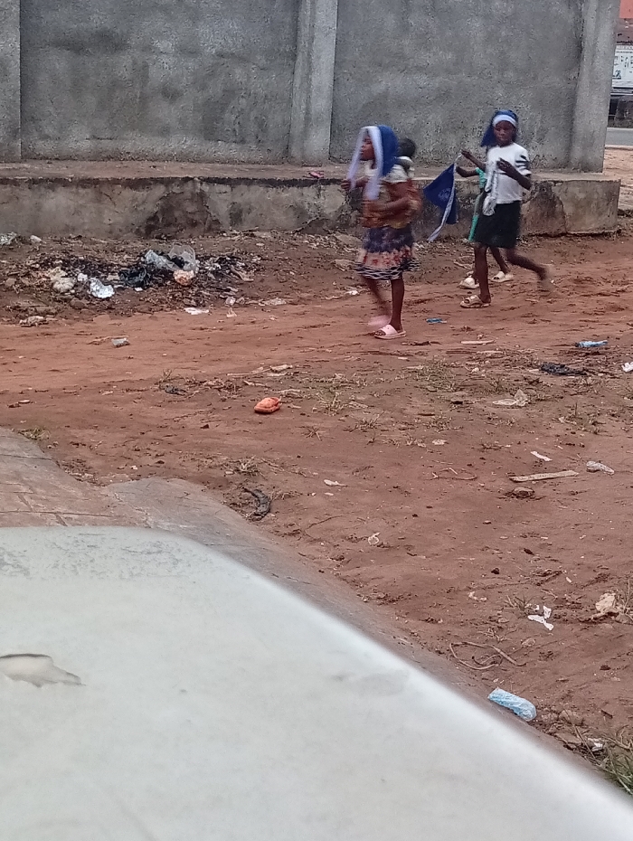 Two girls are seen outdoors. One girl carries a baby on her back and has a white veil with blue trim on her head. The other girl runs alongside, holding a blue cloth. They are on a dirt ground with scattered debris, near a building with a concrete base. Part of a white vehicle is visible in the foreground.