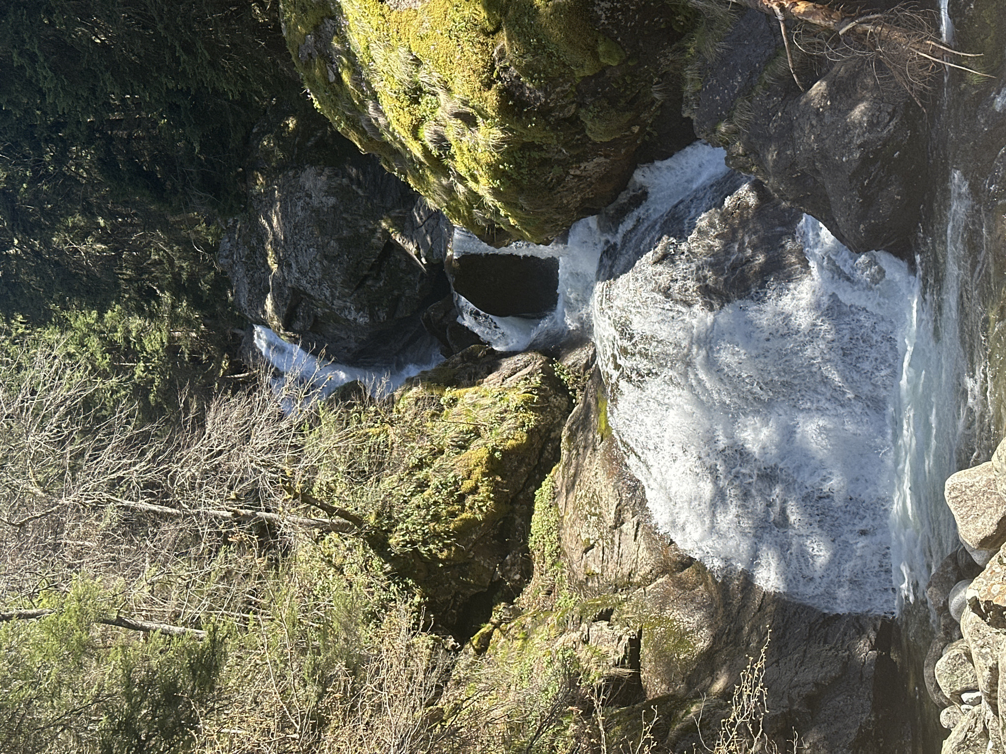 The image depicts a waterfall cascading down moss-covered rocks and stones, surrounded by bare trees and lush greenery