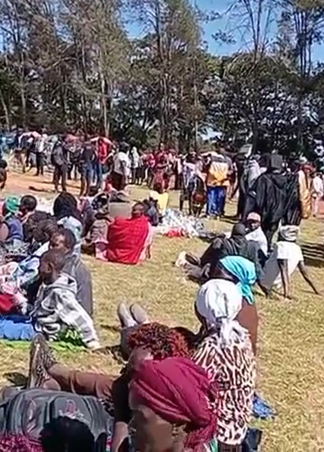 large outdoor gathering of people on a grassy field, possibly for a community event or festival. Many people are seated on the grass, while others are standing and walking around. Some individuals are using umbrellas for shade. In the background, there are white tents set up, suggesting food vendors or informational booths. The setting appears to be a park-like area with trees in the distance, under a clear blue sky.