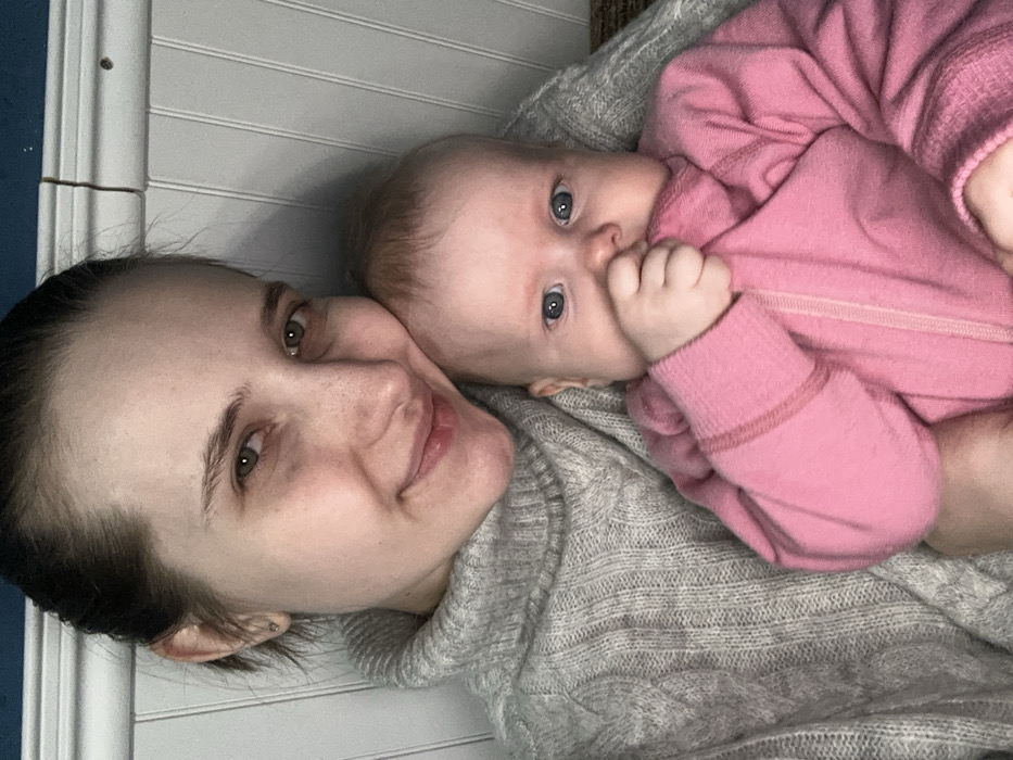 A selfie shows a woman with dark hair pulled back, wearing a gray sweater, lying next to a baby in a pink onesie