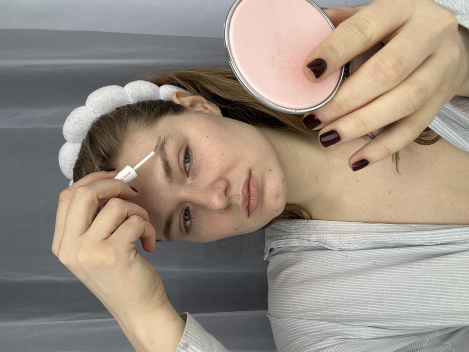A young adult female, with light brown hair and a neutral expression, is depicted indoors, likely in Tashevka, Russia. She wears a white, textured headband and an unbuttoned light-colored, striped garment. Her right hand holds a white applicator, labeled "Extra Fix," with which she is applying a clear or light-colored product to her left eyebrow. Her left hand holds a pink, oval-shaped compact or mirror with a silver edge. Dark red nail polish is visible on her fingers. The background consists of a plain, light grey curtain.