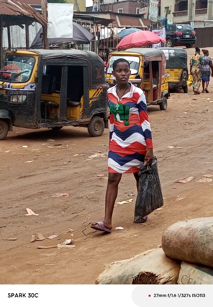 The image captures a vibrant street scene in Onitsha, Nigeria. A young adult female with short dark hair and dark skin occupies the foreground, walking from left to right across an unpaved, reddish-brown dirt road. She wears a long-sleeved dress patterned with red, white, and dark blue chevron stripes, and a green graphic resembling a cactus or exclamation mark with "HI!" text on the chest. She is barefoot in one sandal (purple striped slide) and the other is obscured, carrying a crinkled black plastic bag in her right hand at hip level. Her gaze is directed towards the right side of the frame, slightly above eye level. The dirt road is uneven and covered with scattered debris, including light-colored papers and a banana peel. In the lower right corner, two partially visible, large, worn sacks (possibly cement bags) lie on the ground. In the midground, several three-wheeled autorickshaws (keke napep) are present. A black and yellow tricycle is parked to the left, with its side open, revealing an interior seat. Behind the main subject, another yellow tricycle is visible, and a third appears further down the street on the right. A red market umbrella provides shade behind the tricycles. The background features additional pedestrians, including two women in patterned dresses walking away from the camera. Buildings with corrugated metal roofs and other structures line the street, indicating an urban or commercial area. A black SUV is parked further down the street on the right. The overall environment suggests a bustling, active thoroughfare.