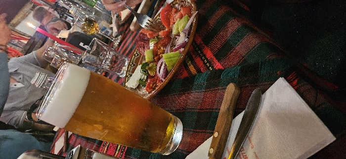 This image depicts an indoor dining scene at a restaurant or tavern in Dobrinishte, Bulgaria