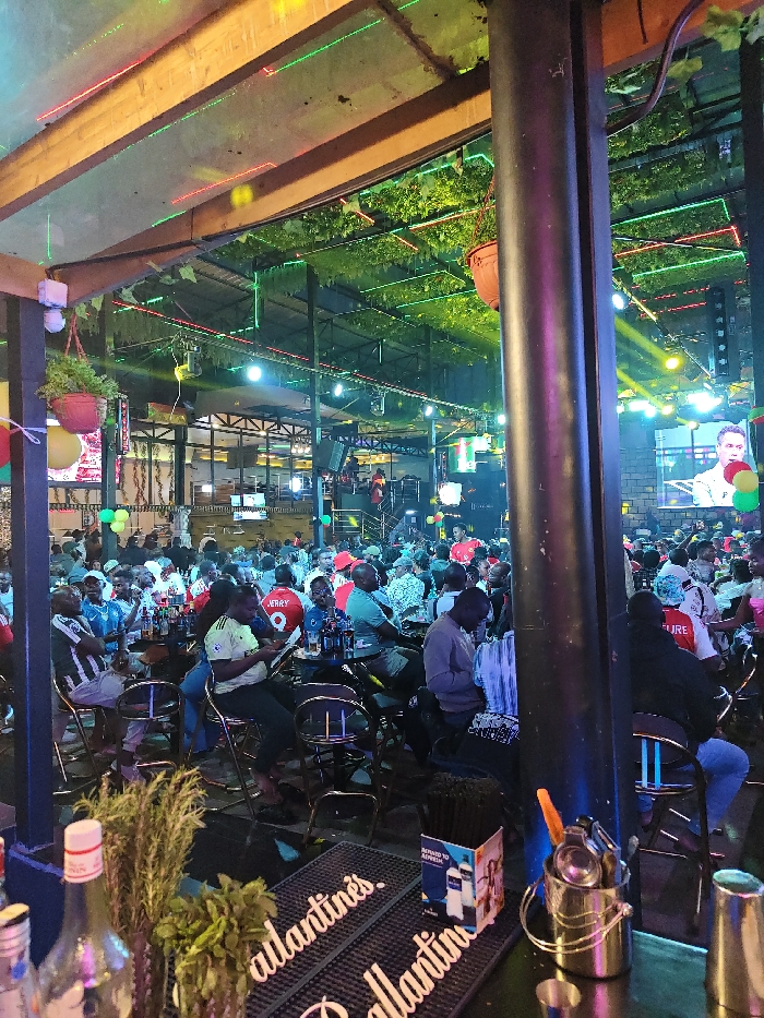 An indoor gathering shows many people seated at tables in a bar or restaurant setting. A large screen displays a person's face. The space has overhead beams decorated with greenery and festive lighting, including red and green lights. Tables and chairs are visible amongst the patrons. In the foreground, bar items such as bottles and accessories rest on a counter. The establishment seems lively and filled with guests.