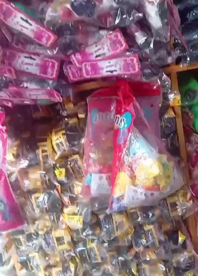 person filming a shelf overflowing with packaged toys in a store. The toys are mostly plastic and include toy guns, phones, cars, and other miscellaneous items. The toys are packed densely, making it hard to distinguish individual items. The shelf is made of wood, and the lighting is somewhat dim. The camera moves slightly, providing a broader view of the shelf's contents. A conversation between two people can be heard in the background.