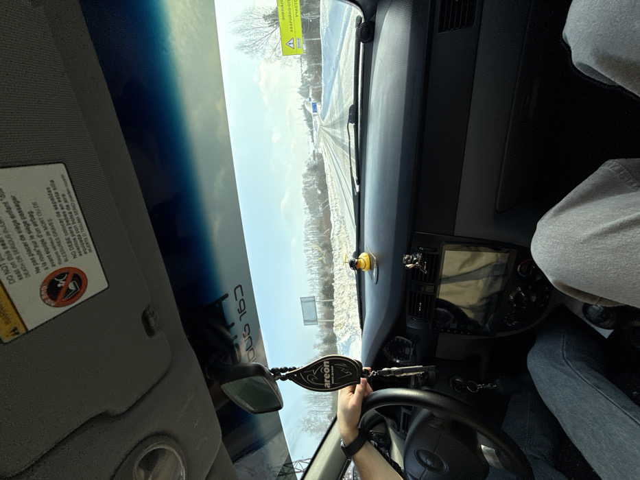 The interior of a car is shown with the steering wheel, dashboard, and part of the front windshield visible. The road ahead is snowy and icy, with trees lining the side. An "Areon" air freshener dangles from the rearview mirror. A sun visor is down on the driver's side, displaying a warning label about airbags and child seats in multiple languages: English, French, and Spanish. A yellow duck toy sits on the dashboard near a car's navigation display.