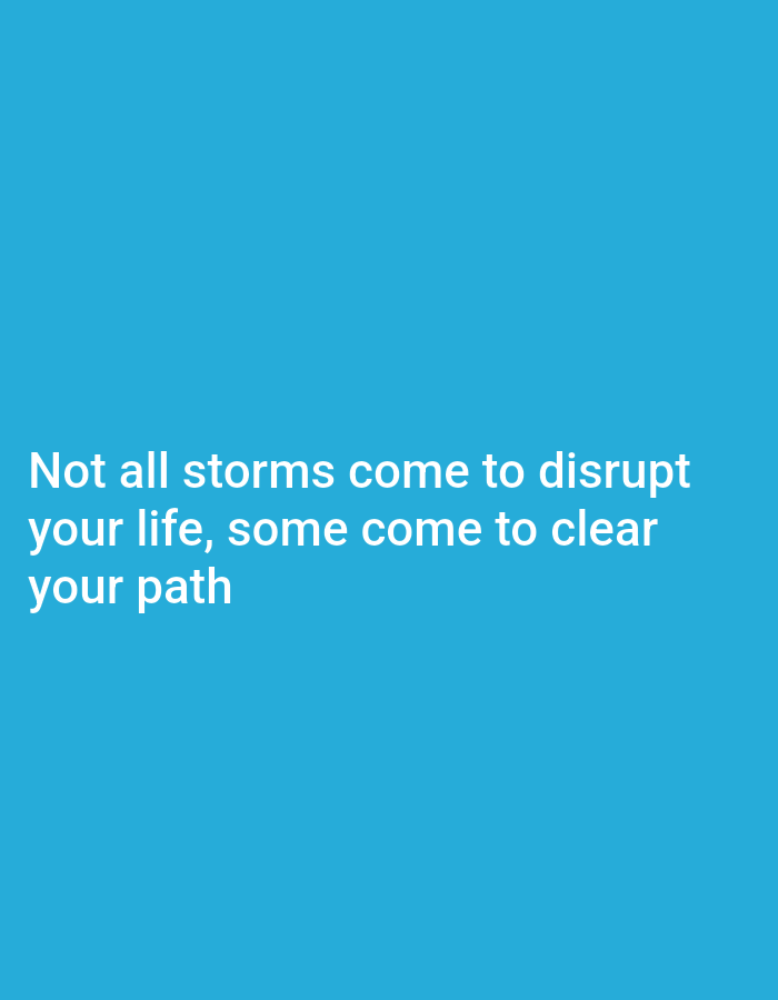 The image displays a solid turquoise-blue background, uniform across the entire frame. White sans-serif text is centered horizontally in the lower third of the image. The text reads: "Not all storms come to disrupt your life, some come to clear your path". No people, physical objects (other than the text itself), actions, or interactions are depicted. The scene is a two-dimensional digital graphic, not a photographic representation of a physical environment. There are no visual elements within the image to indicate a specific geographic location, such as Ouislane, Morocco, or any other city or landscape.