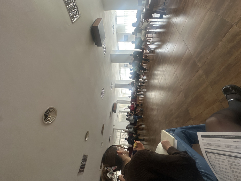 The image depicts an indoor gathering in Horezu, Romania. A group of approximately 20-25 individuals is seated in a semi-circular formation on wooden chairs on a polished brown tiled floor. Most individuals are casually dressed. In the immediate foreground, facing away from the viewer, is a person with brown hair, wearing a dark brown long-sleeved top and blue jeans. This individual is holding an open notebook and a pen in their left hand and a piece of fruit in their right hand. Visible on the bottom right is the lower leg and foot of another person, wearing black tights and a black flat shoe, with a white document resting on their lap. The room features white walls, large windows along the far side providing natural light, and multiple white support pillars. The ceiling is white and includes recessed rectangular light fixtures, circular air vents, and larger rectangular ventilation units. Two framed pictures are visible on the distant wall. A dark wooden table is partially visible on the far right.