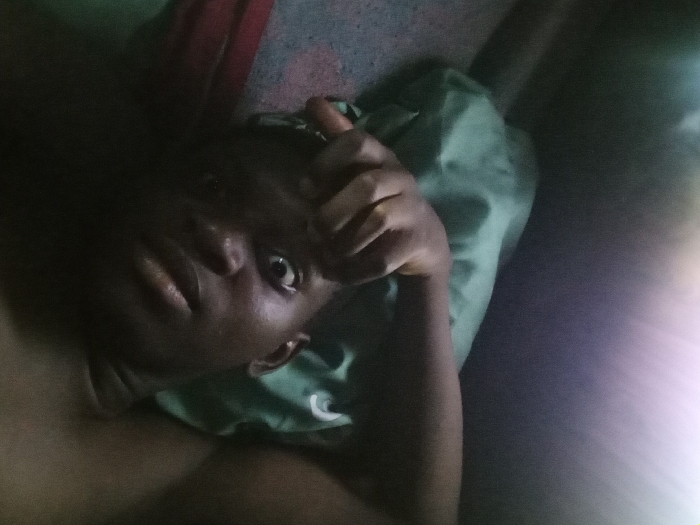 A dark-skinned individual is depicted in a close-up, angled shot, lying on their back. The individual's head is slightly tilted, with eyes wide open and directed towards the camera. The mouth is slightly agape. The left hand (viewer's left) rests with fingers on the forehead. The upper torso appears bare. Behind the individual's head and to the left is a crumpled green fabric, possibly a pillow or blanket. The individual rests on a patterned surface, appearing to be a dark textile with subtle reddish and grayish tones. The background is indistinct and dark, indicating low light conditions. A light source appears to emanate from the upper left, causing a slight glow or flare in the upper portion of the frame. The specific location within the city of Bauchi, Nigeria, is not discernable from the visual information provided.