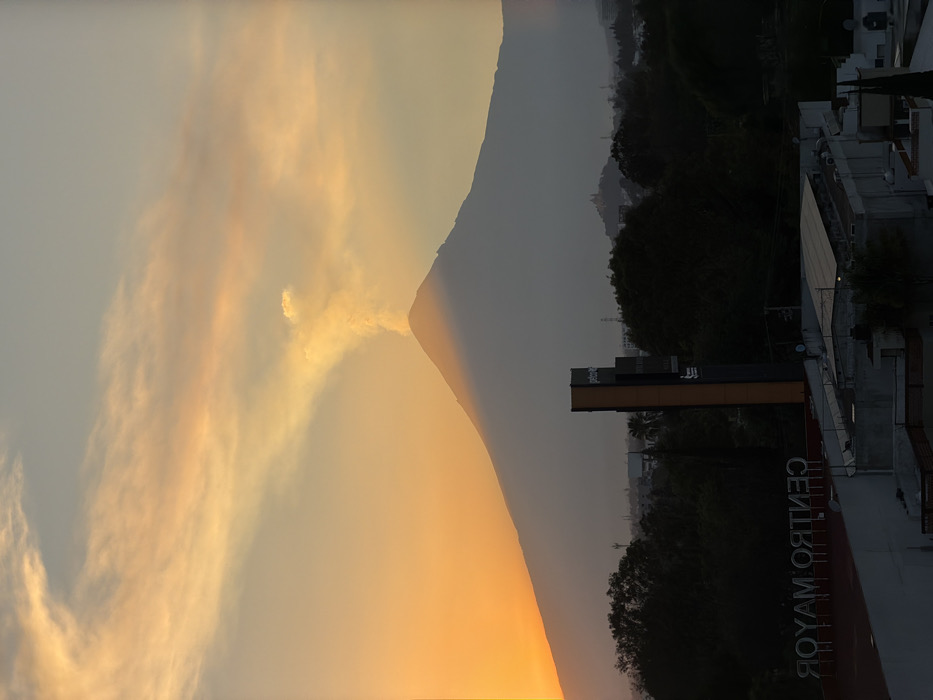 An orange and gray sky behind a towering mountain. The sun sets behind the mountain casting an orange glow, illuminating wispy clouds. The base of the mountain slopes down towards an urban landscape. Buildings, trees, and a sign reading "CENTRO MAYOR" are partially silhouetted against the darkening landscape, positioned to the right of the mountain.