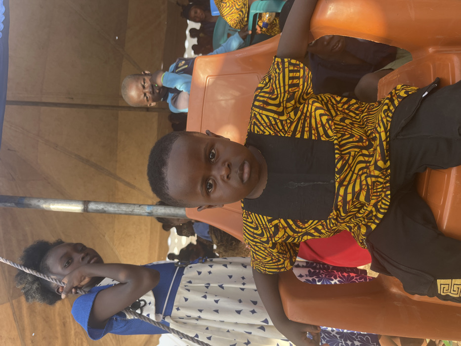 The image captures three Black children at an outdoor gathering in Ajikemai, Nigeria. In the immediate foreground, a young boy with short dark hair, estimated to be between three and five years old, is seated on an orange plastic chair. He wears a short-sleeved top featuring a yellow and black abstract pattern with a solid black central panel, and black trousers with a gold design on the lower left leg. He gazes directly at the viewer with a neutral expression, his arms resting on the chair's armrests. To the left of the foreground boy, slightly behind him, stands a young girl, approximately eight to ten years old, with dark, curly hair pulled up. She is dressed in a blue and white patterned dress with a blue bodice and a white skirt adorned with blue geometric shapes. She holds a vertical rope or cord with her right hand and looks towards the viewer, her left hand near her chin. In the mid-ground, behind and to the right of the foreground boy, another young boy, possibly five to seven years old, with short light-colored hair, is seated on a chair. He wears a light blue long-sleeved shirt and looks towards the viewer with a slightly squinted expression, his right hand near his mouth. The scene is set under a large, light-tan tent canopy supported by metal poles. The background reveals additional blurred figures, indicating a larger assembly of people within the tent structure. Daylight illuminates the scene.