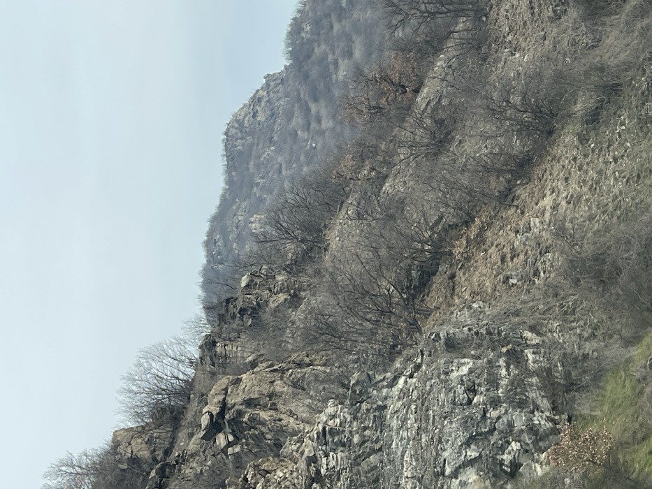 The scene depicts a natural, mountainous landscape located near Draginovo, Bulgaria, under an overcast sky. The foreground and midground are dominated by steep, rocky slopes composed of grey and brownish geological formations, exhibiting both massive rock outcrops and layered sections. Sparse deciduous vegetation, primarily bare trees and shrubs with visible branches, is interspersed across the slopes, clinging to the rock formations and patches of earth. The ground cover consists of dry, light brown vegetation and exposed rock scree. The distant mountains appear hazy and recede into the light grey, uniform sky. No individuals, animals, man-made structures, or specific objects are present within the frame, and no actions or interactions are depicted.