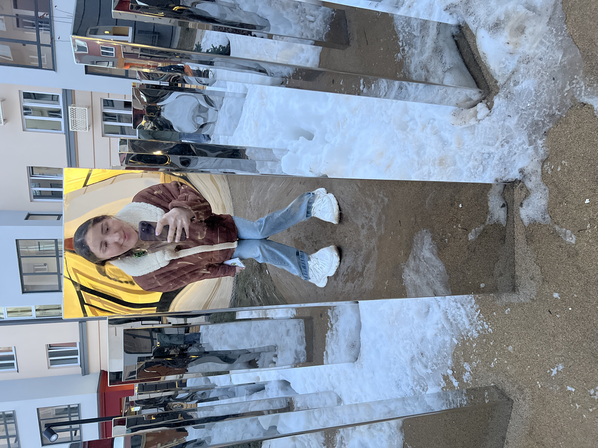A young woman is reflected in a series of rectangular, shiny, metallic columns on a partially snow-covered sidewalk in Chemoshur, Russia. The columns reflect the surrounding architecture. The woman is wearing a brown jacket, blue jeans, and white sneakers, and she is holding a smartphone. The ground is covered in a mixture of snow and tan gravel. Buildings with beige facades, white-framed windows, and other details are visible in the background.