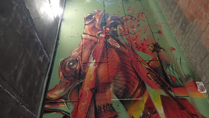 A low-angle shot captures a mural of a fantastical, reddish-brown creature with a visible eye. The artwork is painted on a segmented, greenish surface, possibly a door or wall. The creature appears to be wielding a weapon resembling a mace. A spray of red elements, possibly representing blood or abstract design, is visible. The wall on the left is a textured grey, while the wall on the right appears to be made of brown bricks. A light source shines in the top left corner.