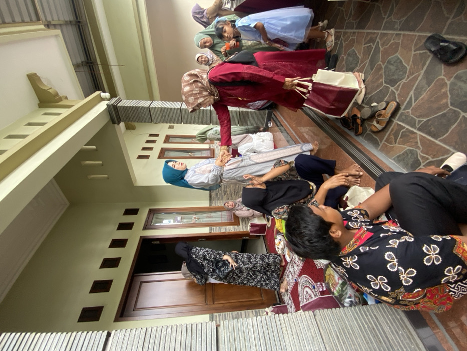 A group of people are gathered outside a house. Several individuals are sitting on a rug. One woman in a blue headscarf is being helped up by another in red. Several other women and a child in a blue dress are standing or kneeling nearby. Shoes are scattered on the tiled porch floor. The house is light-colored with brown doors and windows.