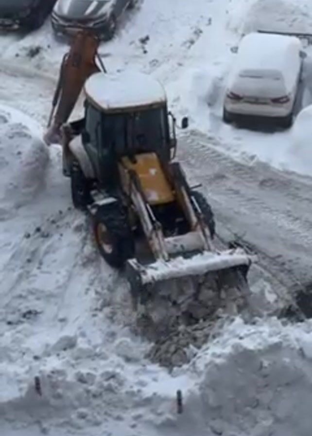 yellow and black backhoe loader clearing snow from a snow-covered parking lot. The backhoe is in the center of the frame, facing the viewer. The bucket is full of snow. There are several snow-covered cars parked in the background. The sky is overcast.