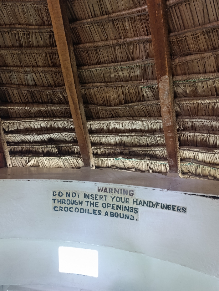 close-up view of a warning sign attached to the underside of a thatched roof. The sign reads, "WARNING, DO NOT INSERT YOUR HAND/FINGERS THROUGH THE OPENINGS, CROCODILES ABOUND". The roof is made of woven palm leaves and supported by wooden beams. The sign is located in Tsavo North National Park, Kenya, near the Mzima Springs (latitude: -2.986, longitude: 38.023). The scene appears to be inside a structure, likely a viewing platform or shelter, offering a vantage point to observe the Mzima Springs, a well-known spot where crocodiles are commonly sighted. The sign highlights the potential danger to visitors and provides a clear warning to avoid putting hands or fingers through any gaps in the roof.