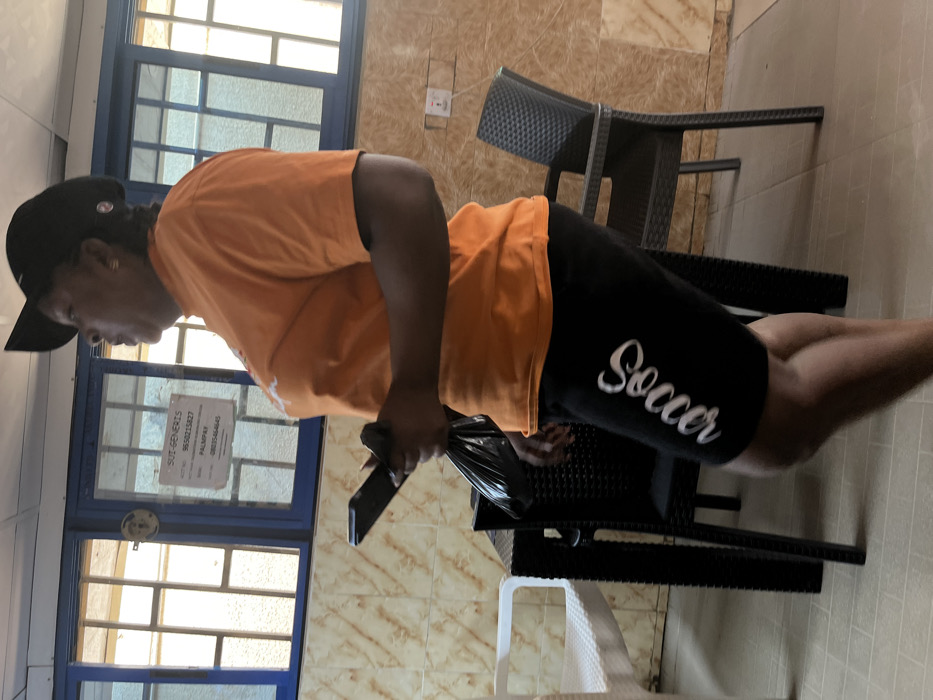 The image depicts an indoor or semi-enclosed commercial space in Abuja, Federal Capital Territory, Nigeria. A single individual, appearing to be female, is captured in profile, facing towards the right side of the frame. She wears a black baseball cap, an orange short-sleeved t-shirt, and black shorts with the word "Soccer" printed vertically in white cursive text on the left leg. Her right hand holds a black smartphone, while her left hand holds a crumpled black plastic bag. Both items are held together near her torso as she stands or moves. The background features a wall with light brown, horizontally-banded tiling on the lower half and a lighter, possibly cream-colored painted surface above. Multiple windows with blue frames are visible, featuring internal grid patterns and allowing natural light to enter. A white paper sign is affixed to one window, displaying text including "SUI-GENERIS," "ACCT NO: 9650215827," "PALMPAY," and a phone number "08035464645." Furniture visible includes a white plastic chair with a woven texture on the left, and a dark, possibly black or dark brown, woven-textured table in the center, partially obscuring another similar dark chair behind it. A standalone dark, woven-textured chair is positioned against the wall on the right. A white electrical outlet is mounted on the wall to the right. The floor is covered with light-colored tiles.