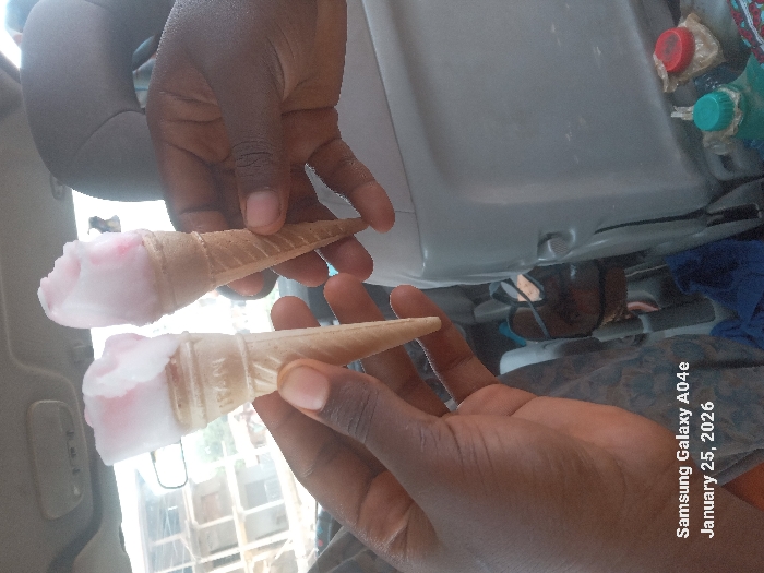 Inside a vehicle in Ogbomosho, Nigeria, two dark-skinned hands prominently hold two ice cream cones, one in each hand, positioned centrally in the frame