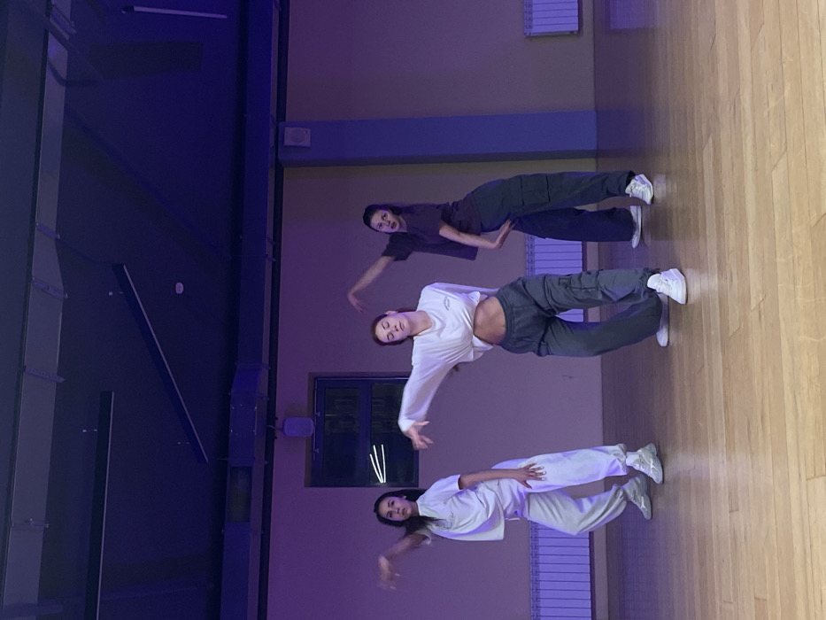 Three young women perform a dance routine in a studio with a wooden floor